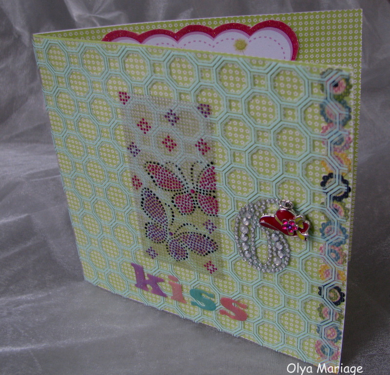 Так как я использовала 2 слоя салатовой бумаги, а сверху еще и плотный прозрачный лист, который, кстати, я приклеила на Glossy accent , то открытка получилась довольно плотной и солидной, что мне очень нравится.